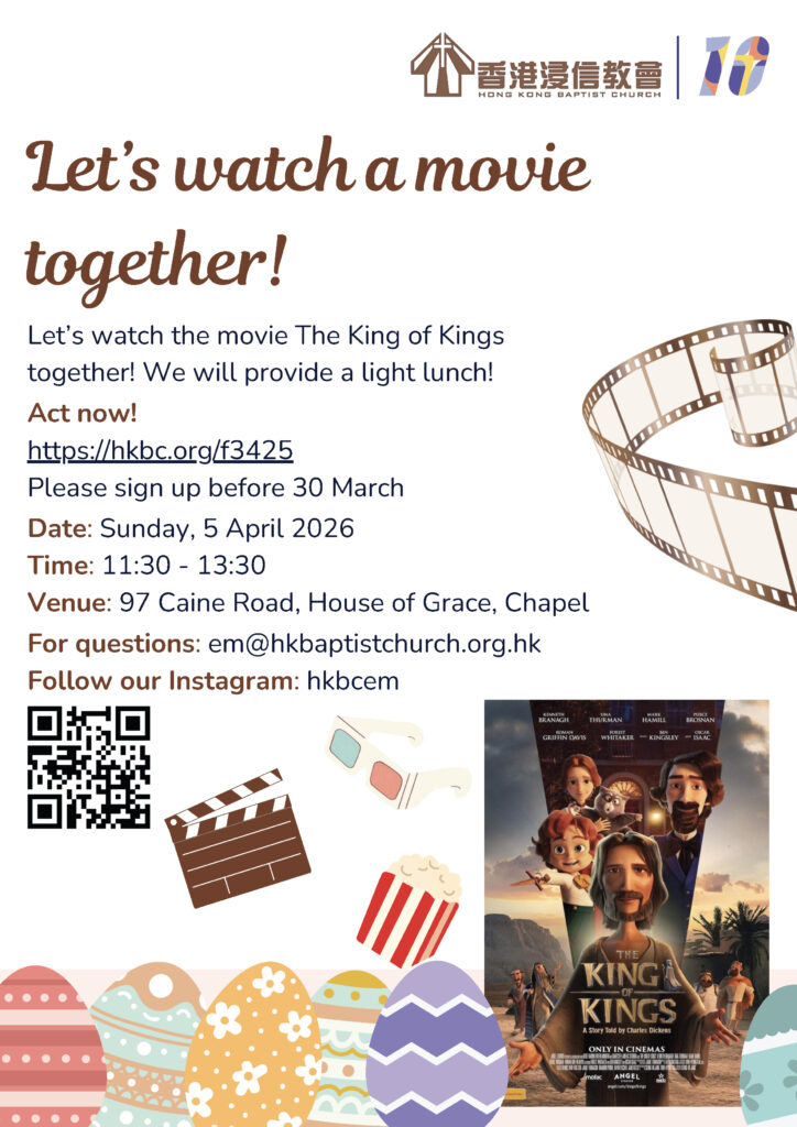 We will provide some simple food, so please sign up, making it easier for us to prepare. Please register through this form: https://hkbc.org/f3425 (Before 30 March).