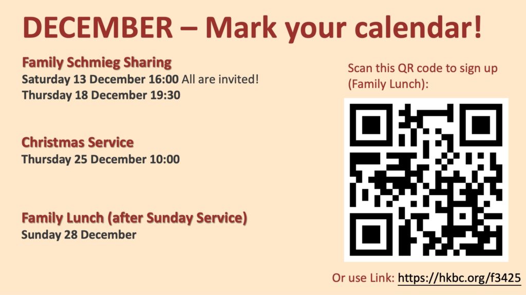On Saturday 15 November is the monthly prayer meeting of our congregation, at 16:00 in room 502, HoG. If you have any prayer request, please contact minister Alexander.