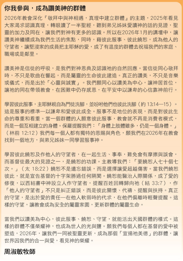 新年聯合崇拜:上午10:00 (一樓禮堂)